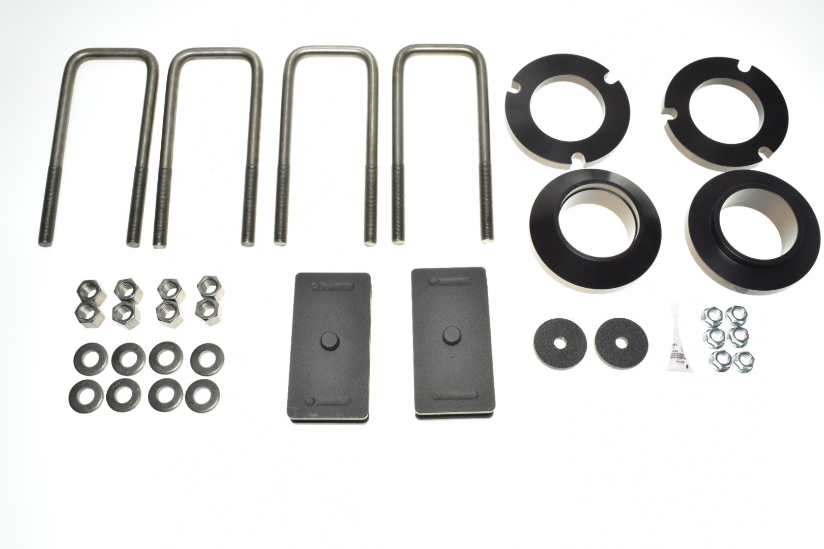 Westcott Designs? Tacoma SR5/SR preload collar lift kit. This kit is designed for the 2004-2023 (2nd & 3rd Gen) Tacoma SR5/SR with the black body Hitachi shocks from the factory. It gives you 3? of lift in the front without the need of a replacement Upper Control Arm (UCA) and 1? in the rear. After install your Tacoma will sit level front to rear and you can run the popular 33? tall tire (285/70R17). It features our billet preload collars for the front and our billet rear lift block with hardware for the rear. This kit uses the preload in your spring to give you the lift that you are after, you retain your factory ride quality, it keeps your factory suspension geometry, and you can still align it to spec after install. Made in the USA.