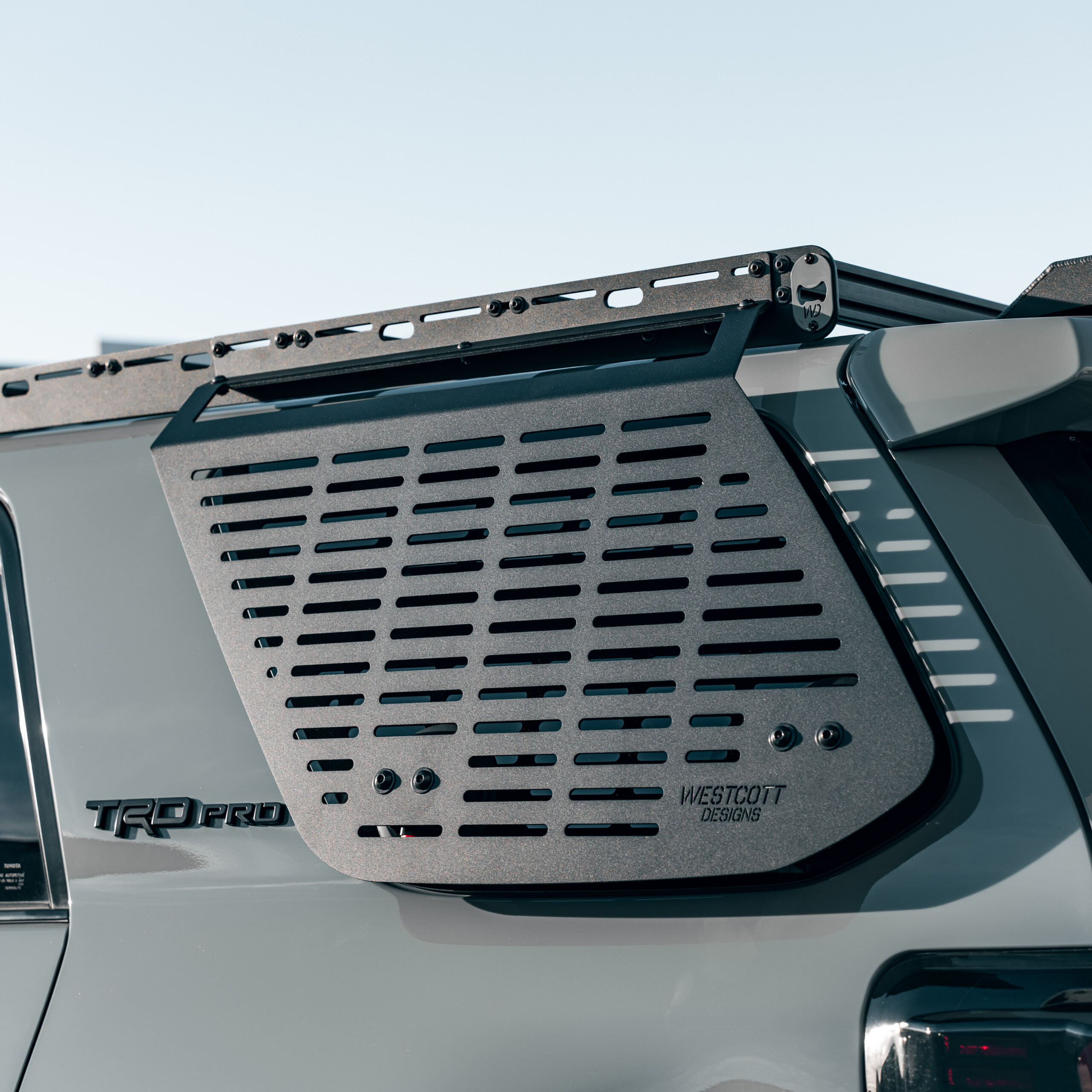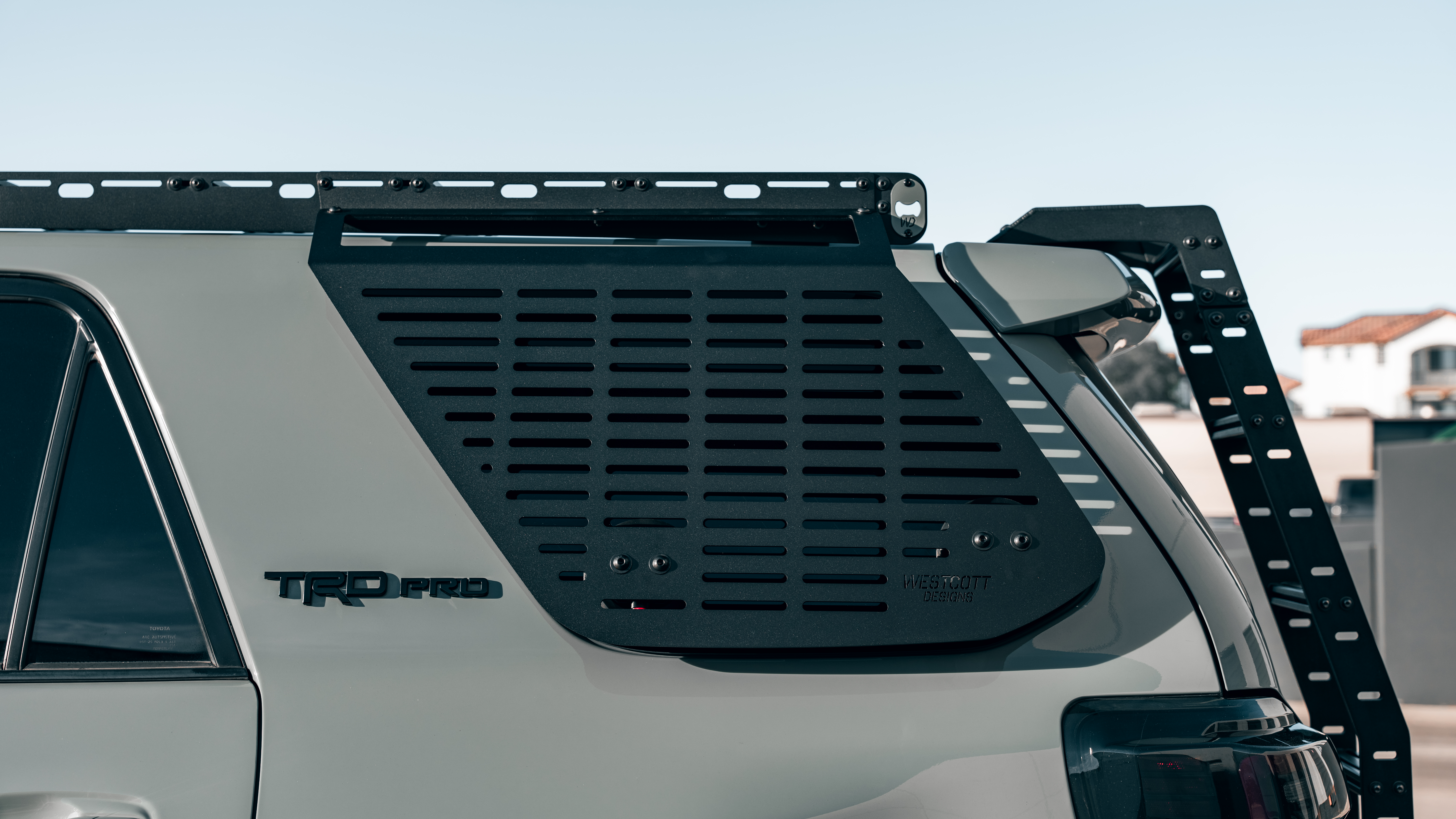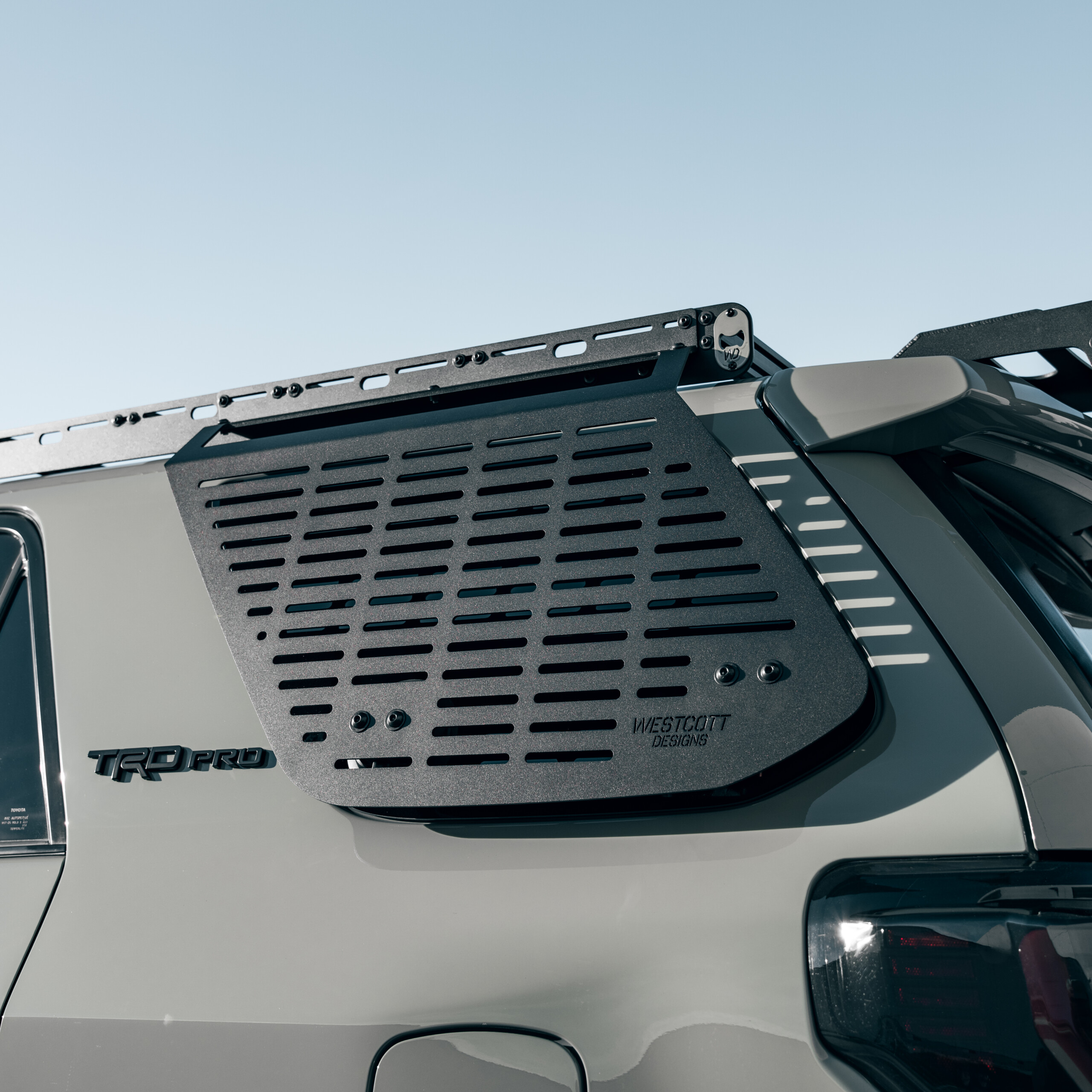 Check out the Westcott Designs molle panels for the 2010-2024 (5th Gen) Toyota 4Runner.  You can choose Driver-Side, Passenger-Side or the full Pair to add to your 4Runner Overland Set-up.  Laser cut and powder coated for a strong durable finish attached to the 4Runner Lo-Profile Roof Rack or Modular Roof Rack.   Includes two 4.5” Industrial Vacuum Pump Suction Mounts. Allows you to mount various accessories and attachments to the side of your 4Runner.  Available in Driver-Side, Passenger-Side or get the Set!
