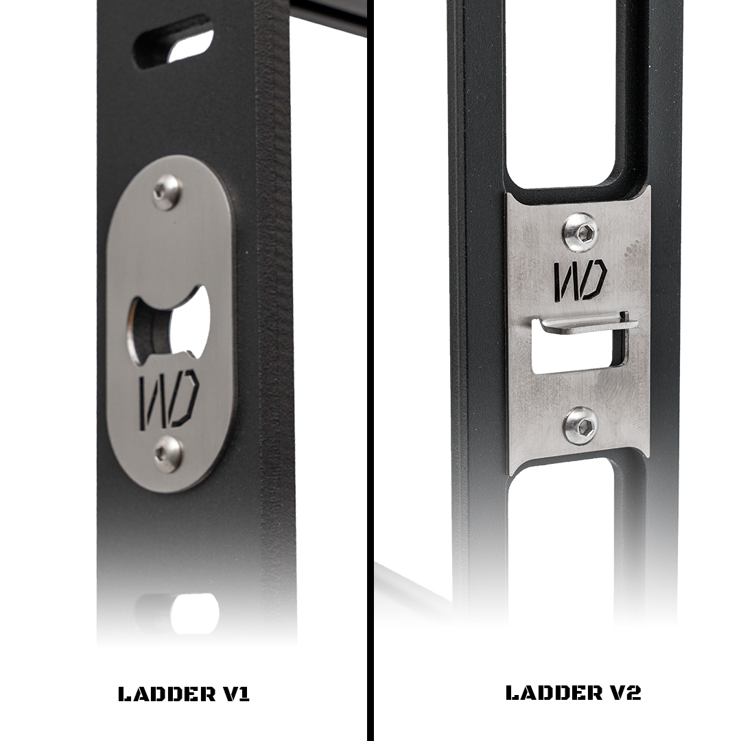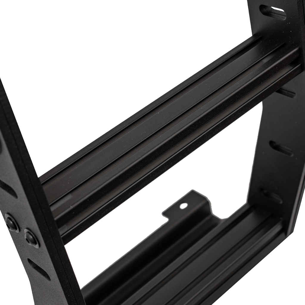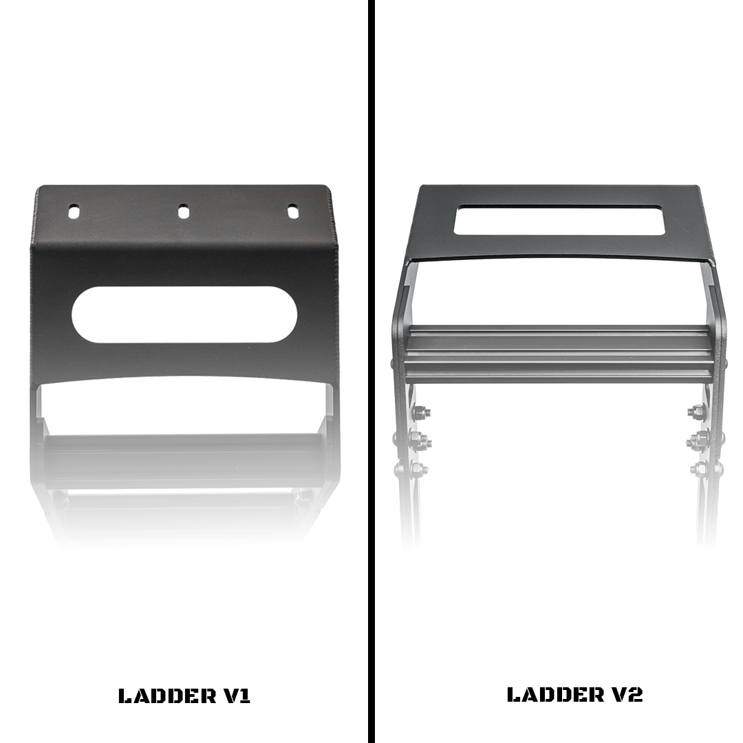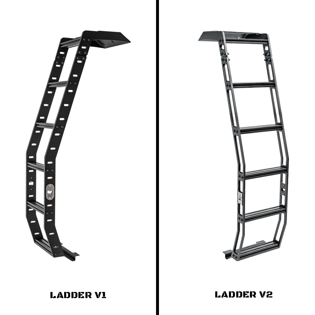 You’ll find that we enlarged the cutouts in the side rails and top plate to lose some weight in version 2.0 without compromising rigidity and stability. Version 1.0 matches the same style as our 5th Gen 4Runner roof rack with the cut-outs in the side rails.? And, for both ladders, we realized all other ladders on the market just did not have large enough steps, so we took it to the next level. We put in a 1?x 2? step to reassure a solid step ever time. Each step has t-track slots in it to allow for additional attachment points. This ladder is the most solid mounting ladder on the market!
