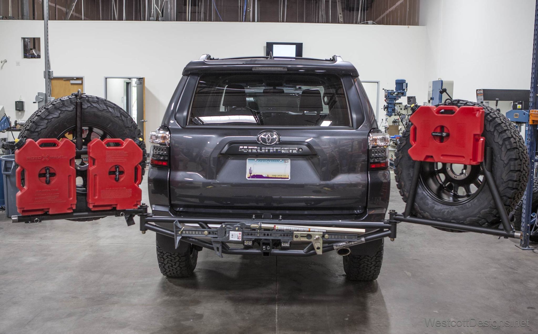 This Hitch Mount Rack comes equipped with standard driver and passenger side tire racks. The tire racks are designed to hold up to (2) 37″ tall tires. Included is a Hi-Lift jack mount (Designed with the Hi-Lift X-Treme 48″ Jack), light tabs,  (2) 2″ Y tire straps, auxiliary hitch receiver, and two stainless steel CNC bottle openers.